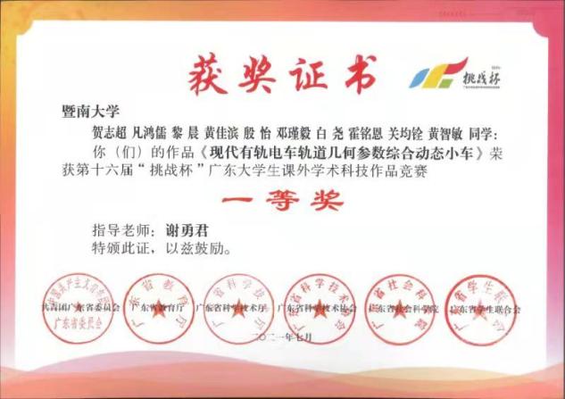 在第十六届“挑战杯”广东大学生课外学术科技作品竞赛(以下简称挑战杯省赛)中,由我院教师谢勇君指导,贺志超、凡鸿儒、黎晨、黄佳滨、殷怡、邓瑾毅、白尧、霍铭恩、关均铨、黄智敏同学共同申报的作品《现代有轨电车轨道几何参数综合动态检测小车》荣获一等奖。