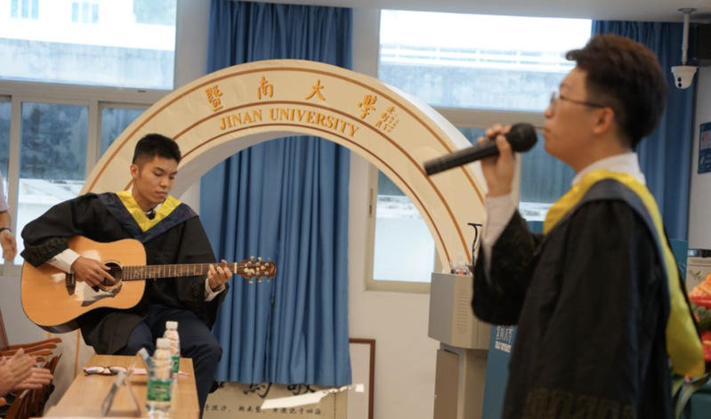 毕业生代表、2022届自动化专业毕业生殷怡同学代表全体毕业生向母校和学院表达了感激之情,并带领全场毕业生诵读了暨南精神“忠信笃敬、知行合一、自强不息、和而不同”。