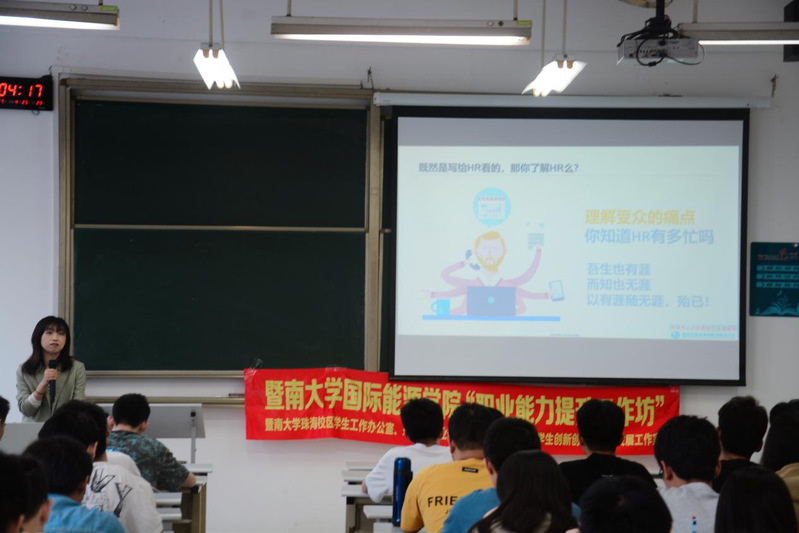 4月27日下午,“职业能力提升工作坊”系列讲座之“资深HR教你写简历”在教学楼415课室召开,国家人力资源管理师、知名企业培训师陈少嫚担任主讲人,本次讲座主要讲授了简历撰写的技巧。