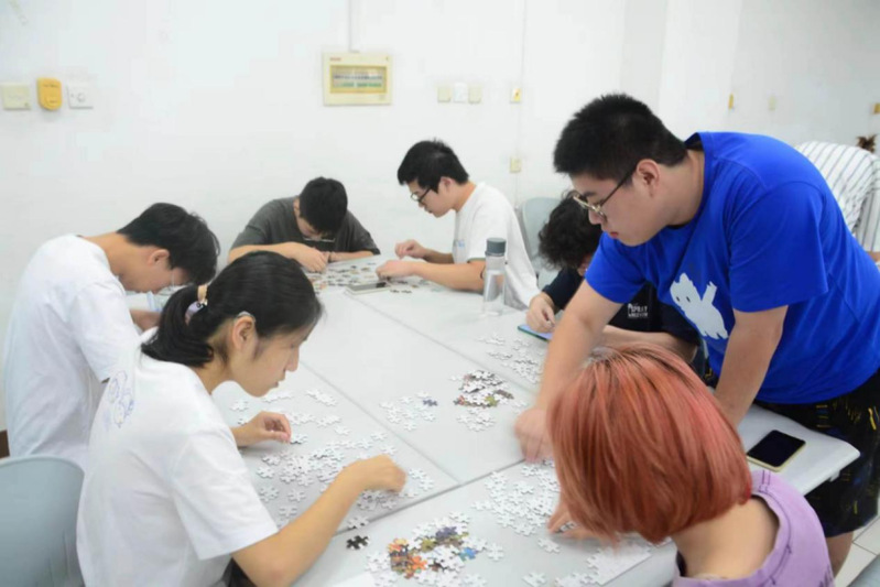 活动伊始,主持人对四个游戏规则进行简要介绍。本次活动共有三个小组,每组通过参与五子棋比赛、常识答题、四阶数字华容道、投壶四种趣味小游戏获取拼图碎片,争分夺秒完成拼图。“单丝不成线,独木不成林”,为了尽快拼凑出圆满的拼图,各组成员相互帮助、相互配合、争分夺秒,在游戏桌上进行着头脑风暴。