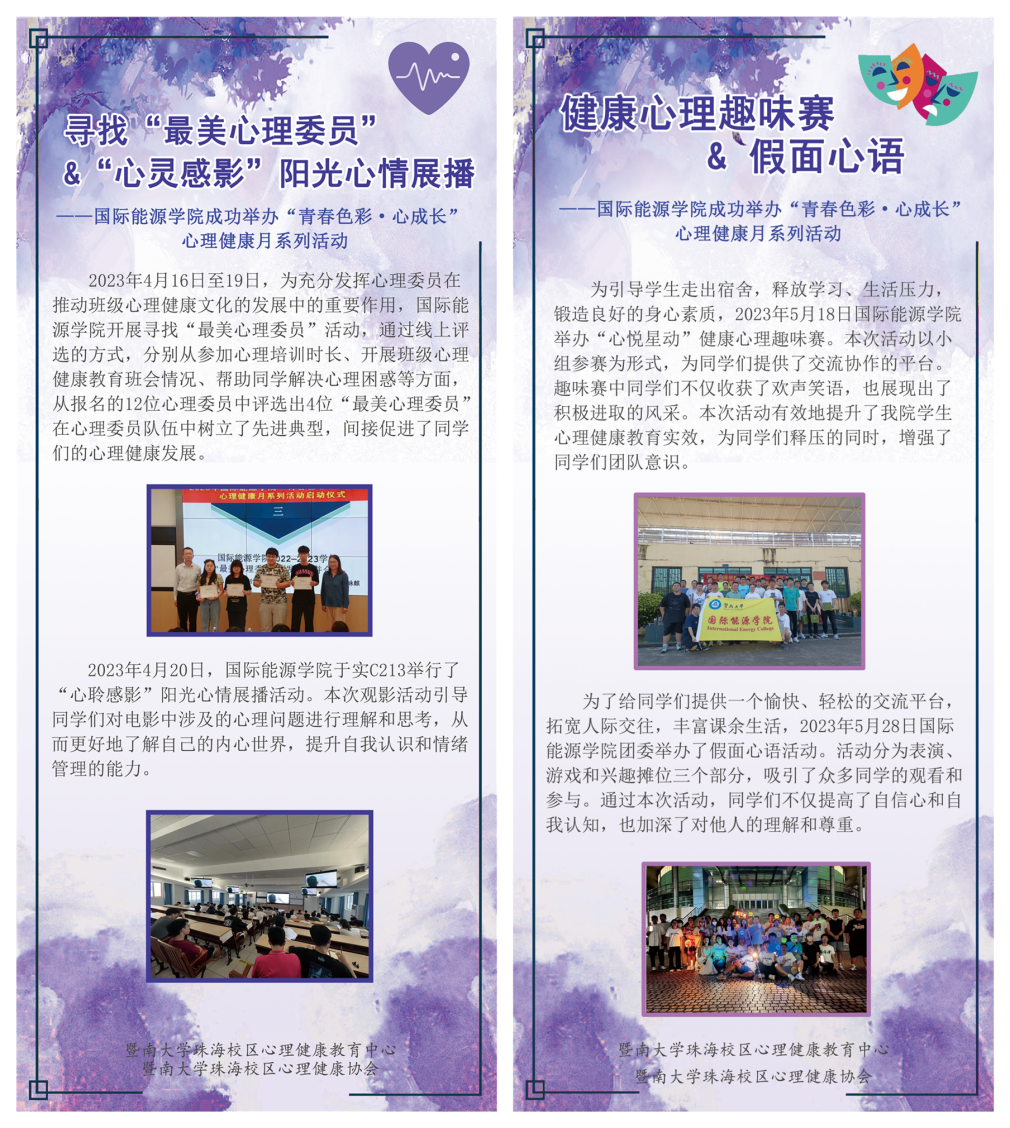 麻豆在线 /能源电力研究中心高度重视心理健康教育工作,在学校心理健康教育中心的指导和校区心理健康教育中心的支持下,于4月-5月启动和开展麻豆在线 “青春色彩·心成长”心理健康月系列活动,包括寻找“最美心理委员”、“心聆感影”阳光心情展播、“心悦星动”健康心理趣味赛、“假面心语,活力社区”等活动。