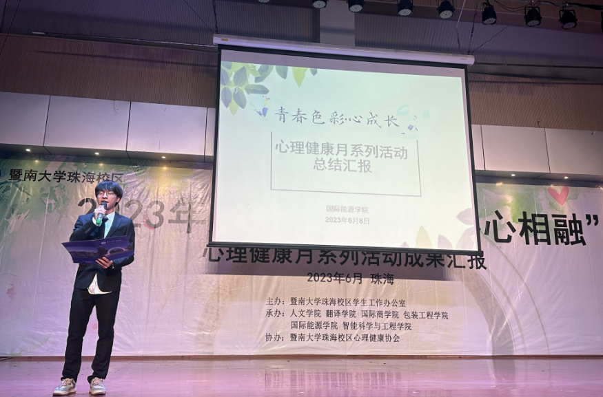 6月8日晚,珠海校区2023年度“春暖花开 心心相融”心理健康月系列活动成果汇报在学生活动中心顺利开展,学院师生代表参加活动并就学院心理健康月系列活动开展情况作总结汇报。至此,为期一个多月的“青春色彩˙心成长”心理健康月系列活动正式落下帷幕。未来,学院将继续同学校、校区各部门联动,建立健全心理育人机制,多方协同、整体智治、家校合作,分层分类分阶段开展心理健康教育,以多形式校园文化活动提高学生心理调适能力,有效提升心理健康教育实效。