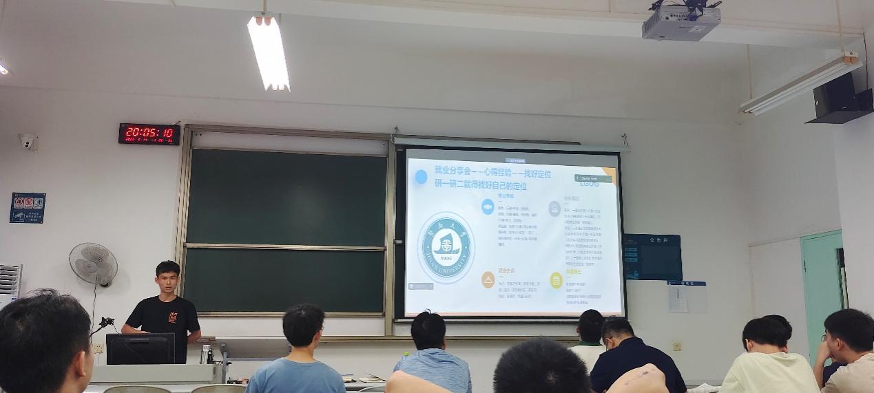接下来,研究生支部五位研究生党员面向全体党员和2022级研究生同学做了精彩生动的学涯经验分享。2023届学校优秀毕业生的马瑞鑫同学是一位全面发展的优秀学生党员。作为上海交通大学录取的准博士生,他分享了自己申请博士的详细经历,指引师弟师妹如何成功申请博士项目。王昱乾同学即将升学至哈尔滨工程大学,他分享了自己如何从专业研究匹配入手,通过邮件联系导师和顺利通过面试的经验。伍颖欣同志介绍了春招就业趋势,针对自己的职业选择,针对择业问题提分享了个人心得。李相同志精心准备了求职经验PPT,对求职过程中面临的多项问题做了非常充分的解说,事无巨细的分享了在找工作过程中需要注意的事项和信息,干货满满。李云辉同志就自己在考编考公、国企和私企之间选择的经历进行了分享。 最后,刘雄副教授和苏潇老师为五位研究生代表颁发了纪念品,以表彰他们在学业和党建方面的先锋示范作用。