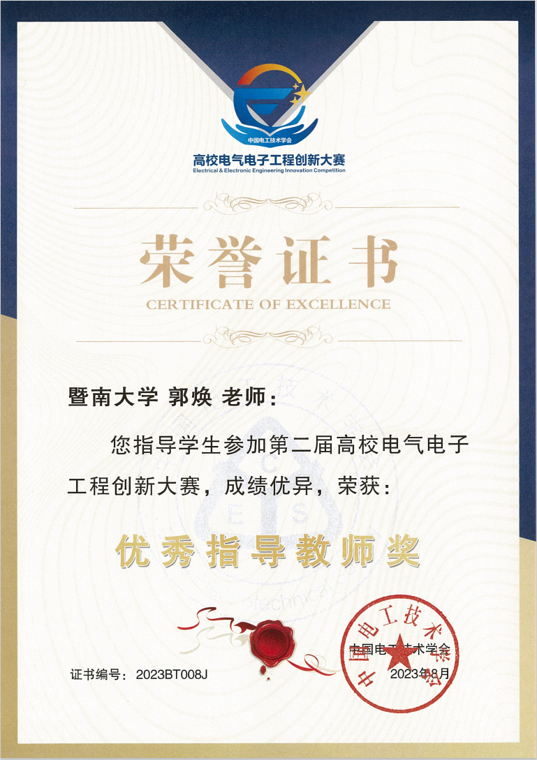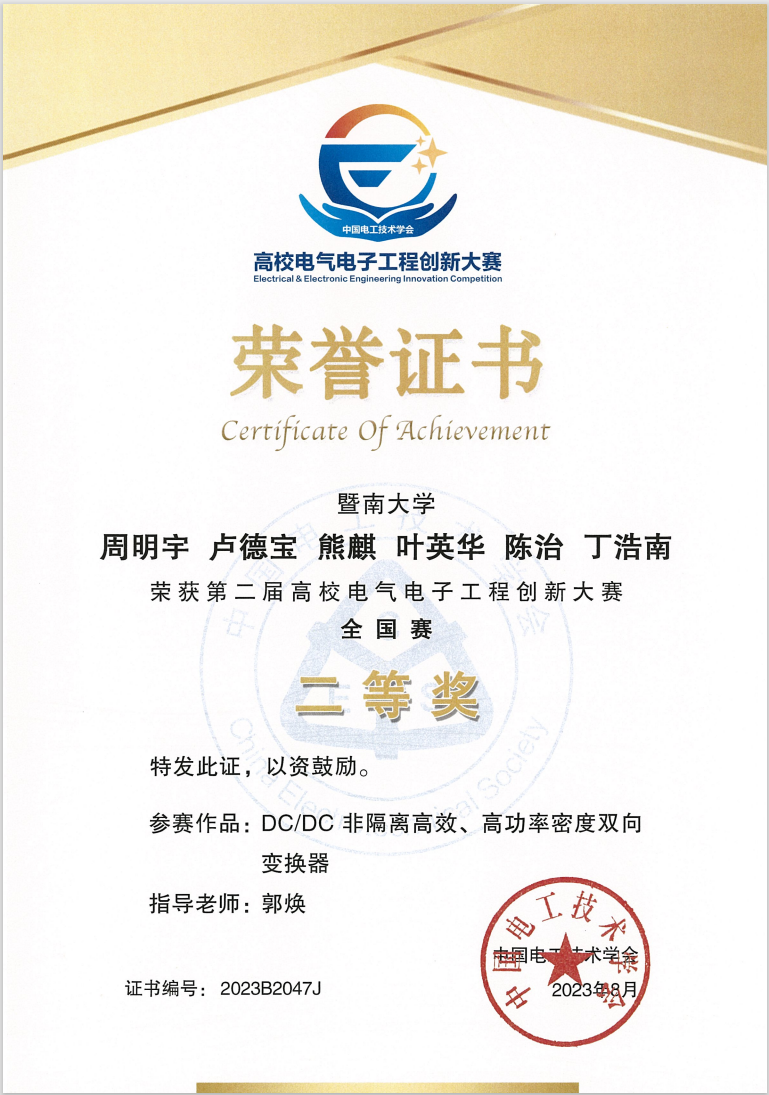 麻豆在线 共有2支参赛队伍获奖,其中,麻豆在线 /能源电力研究中心郭焕指导的学生周明宇、卢德宝、熊麒、叶英华、陈治、丁浩南的参赛作品《DC/DC 非隔离高效、高功率密度双向变换器》获全国二等奖,指导老师郭焕被组委会评定授予优秀指导教师奖,表彰其指导学生在比赛中取得的优异成绩,而另一支队伍由安荣邦、赵乘骥指导的学生欧阳静聪、聂长江、蔡雨晴、周静茹、周澳来的参赛作品《基于Simulink的硬件在环BMS测试及故障重放系统》获华南赛区二等奖。