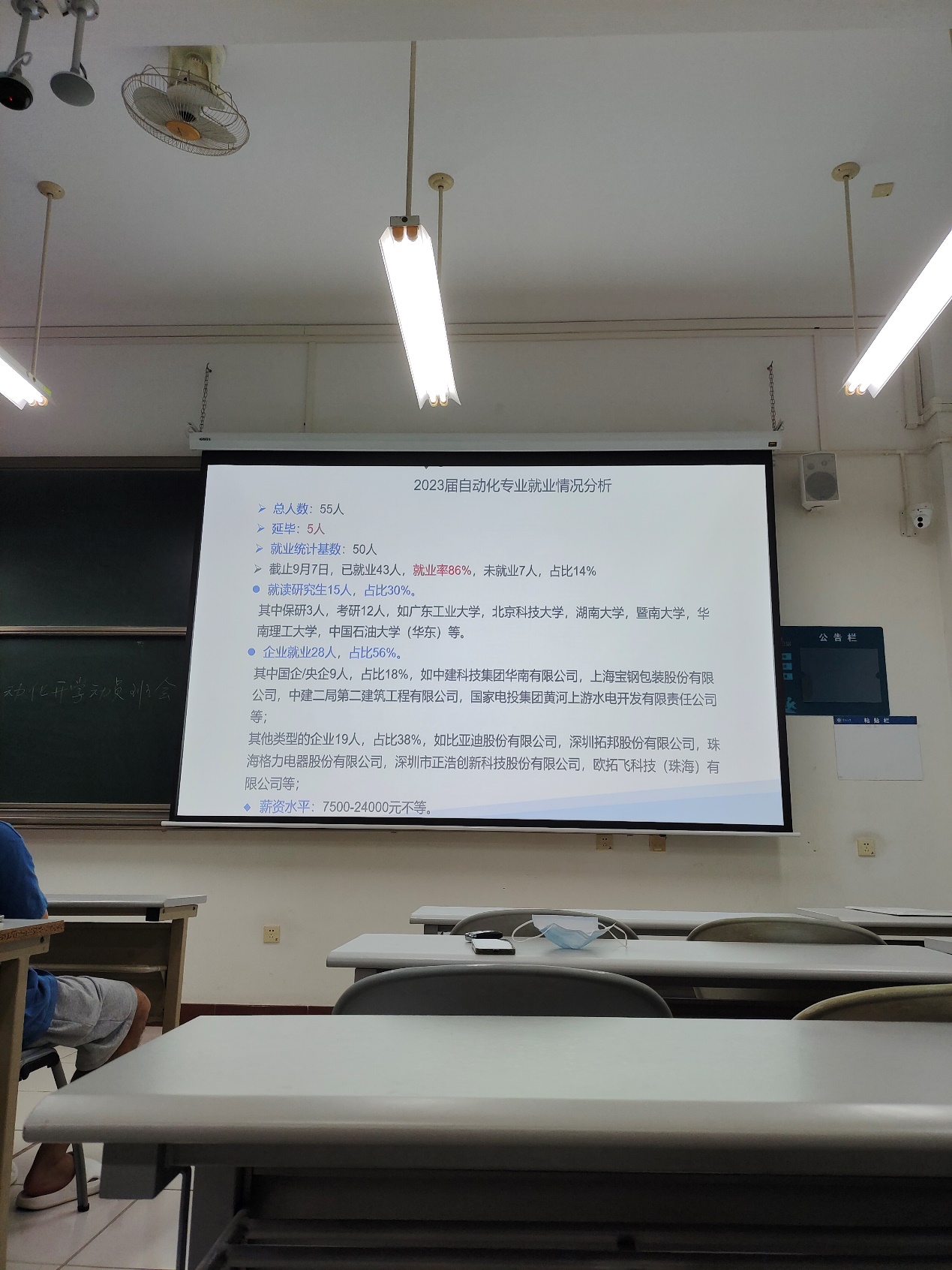 接下来进行的是关于工作实践方面的分享。辅导员李璟璐老师介绍了2023届毕业生的毕业去向,分析考研及就业的类别,提醒大家从本学期起在学习和专业技能提升方面尽早做准备,为将来毕业、求职或考研打下坚实基础。