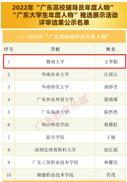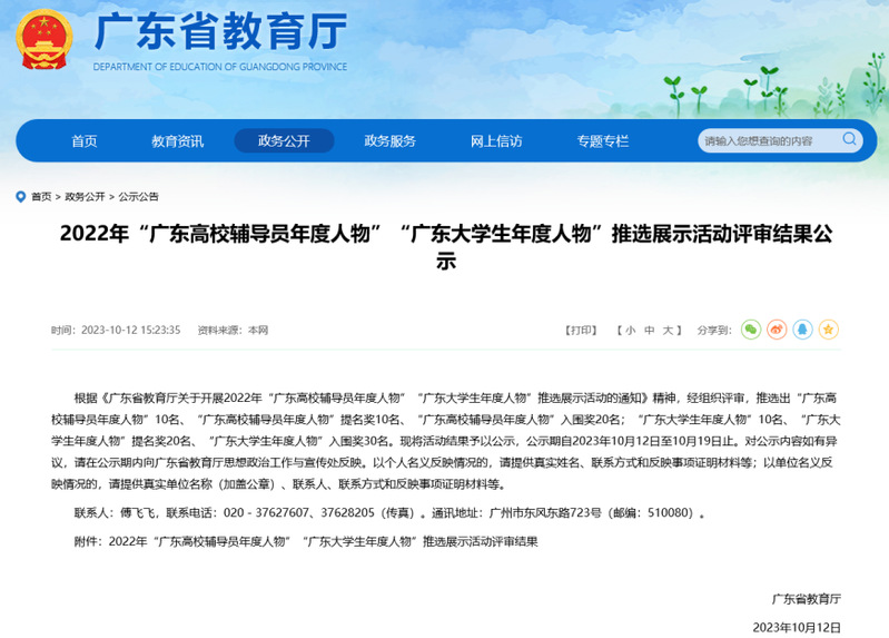 2023年10月19日,由广东省教育厅组织开展的“2022年广东高校辅导员年度人物”推选展示活动结果揭晓。