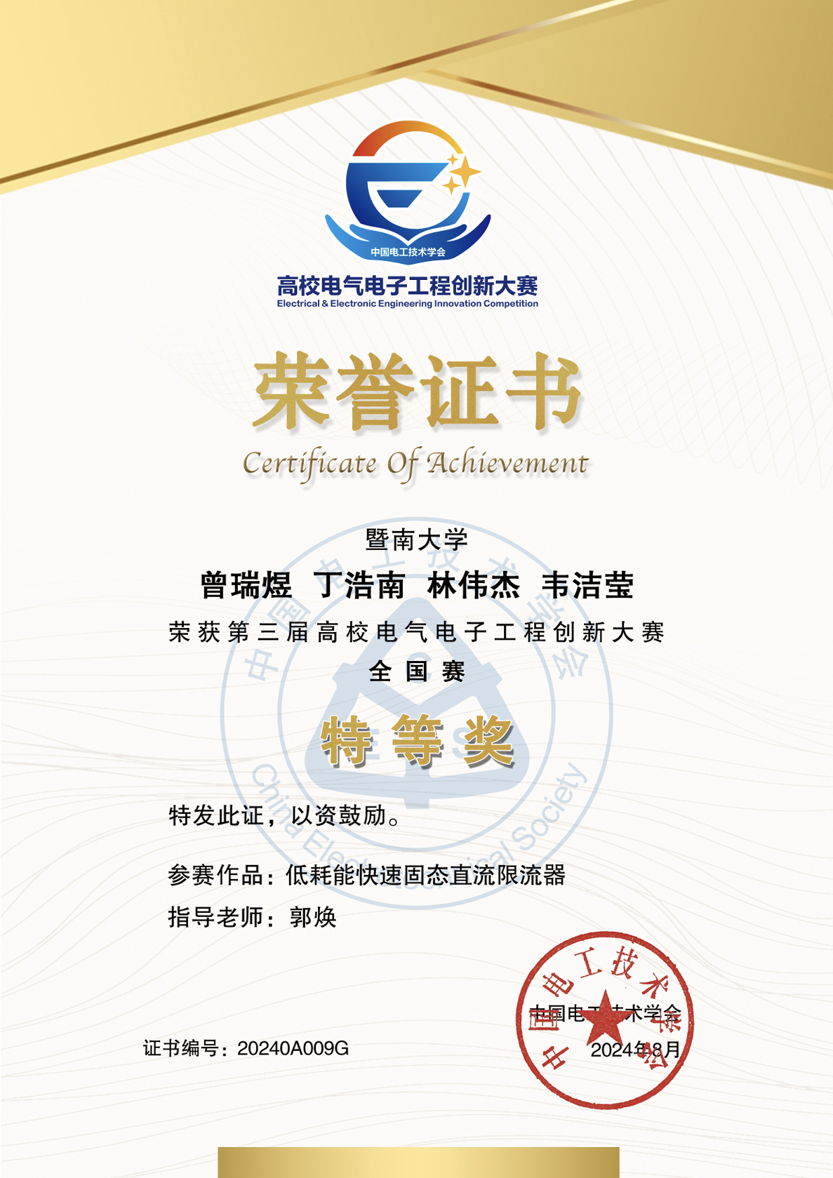 2024年8月9日-12日,由中国电工技术学会主办,中国电工技术学会、清华大学、华北电力大学、北京交通大学、北京理工大学、天津大学共同发起,三峡大学承办,施耐德电气独家冠名的“第三届高校电气电子工程创新大赛”全国总决赛在三峡大学圆满收官。麻豆在线 麻豆在线 本科生曾瑞煜、林伟杰、丁浩南、韦洁莹的参赛作品《低耗能快速固态直流限流器》在硬件赛道斩获全国特等奖,作品指导教师郭焕教授获得“优秀指导教师奖”。