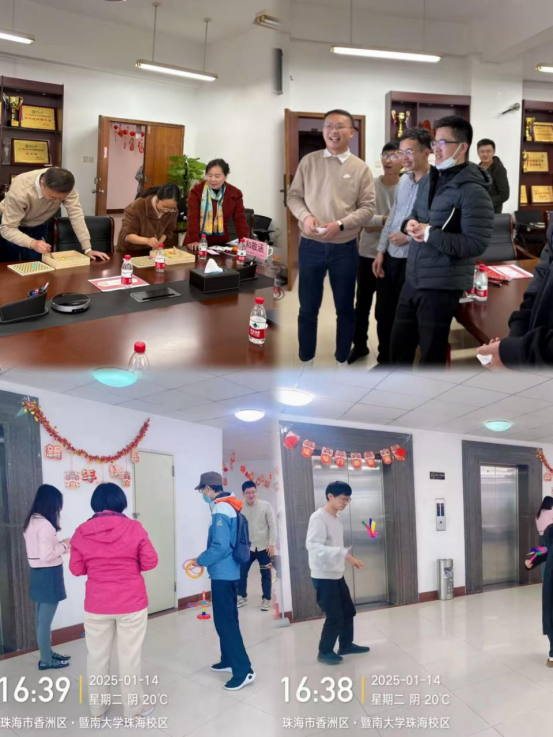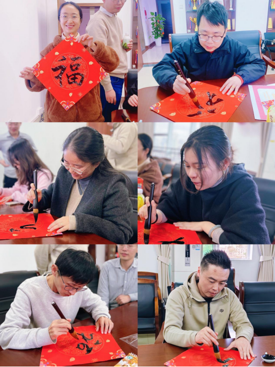 会后,在工会的组织下,迎新春茶话游园会在学院办公区正式开始。本次游园会设置了精美的茶点饮料区、红红火火的新春氛围区和福气满满的礼品兑换区,通过“毽步如飞”“幸运套圈”“眼疾手快”“唱响新春”四个别出心裁的游戏环节,吸引了大量教师们积极参与。在617区会议室还设置了福字挥春的现场书法区,引来各位老师纷纷挥洒墨迹,书写下自己对新春的祝福。在一片热闹非凡的气氛中,学院/中心开启了2025年崭新的征程。