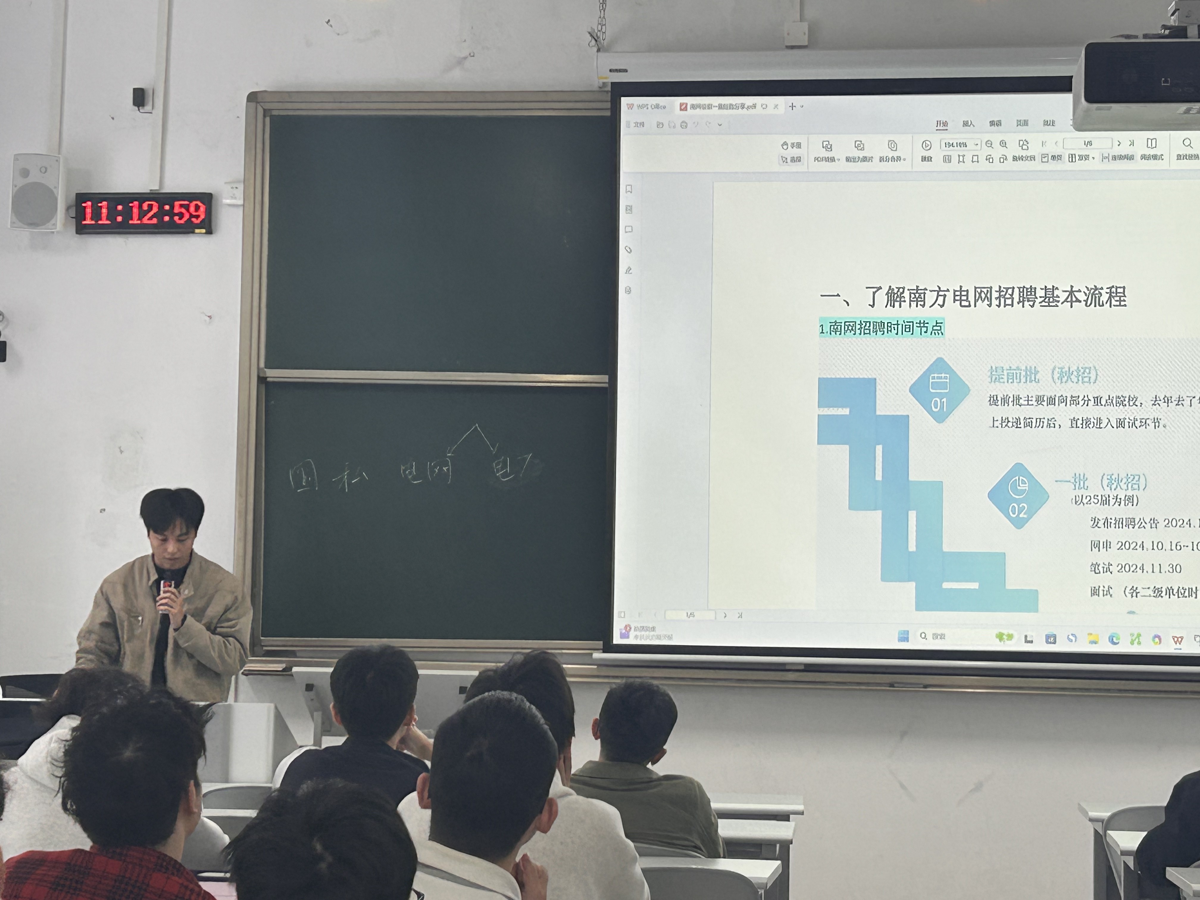2021级电气工程及其自动化专业林育煊则从备考南方电网的角度出发,分享了信息获取渠道和笔试备考攻略。他指出:同学们应提前了解电网的组织架构,为网申做好准备。他提供了一些笔试备考和面试准备的建议,强调准备好自己的经历描述,以增强面试时的自信。