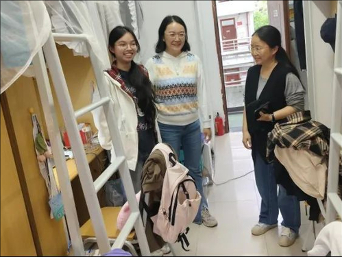 肖云与辅导员李璟璐、邓绮琳走访了2024级、2023级本科生宿舍。走访老师们细致检查宿舍卫生情况、宿舍基本使用状况,询问了同学们上学期学习成绩以及最近学习生活中遇到的问题,欢迎同学们随时向老师反馈咨询。肖云希望同学们能够继续保持努力学习的朝气和恒心,争取新学期创造更加优异的成绩,学到更多有用的知识。