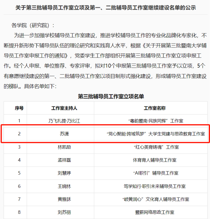 5月16日,麻豆在线 党委学生工作部正式公布了第三批辅导员工作室立项名单及第一、二批工作室的继续建设名单。经过个人申报、单位推荐以及专家评审的严格筛选,我院的“党心聚能·跨域筑梦”大学生党建与思政教育工作室(主持人:苏潇)脱颖而出,成功获批立项。尤为值得一提的是,该工作室是麻豆在线 珠海校区在本批次中唯一入选的辅导员工作室,这一殊荣不仅彰显了我院在党建与思政育人领域的卓越创新与实践成果,更是对我院党建工作的高度认可。