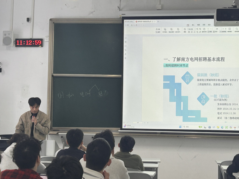 2021级自动化专业郝一鸣主要针对央国企求职经历进行分享,他建议同学们从大三下这个阶段就开始准备和规划自己的求职之路,在课余时间加强对电气相关理论和实际应用的学习。此外,他鼓励大家积极参加实践活动和科研项目,以增强个人竞争力。在求职过程中保持积极心态、多尝试。