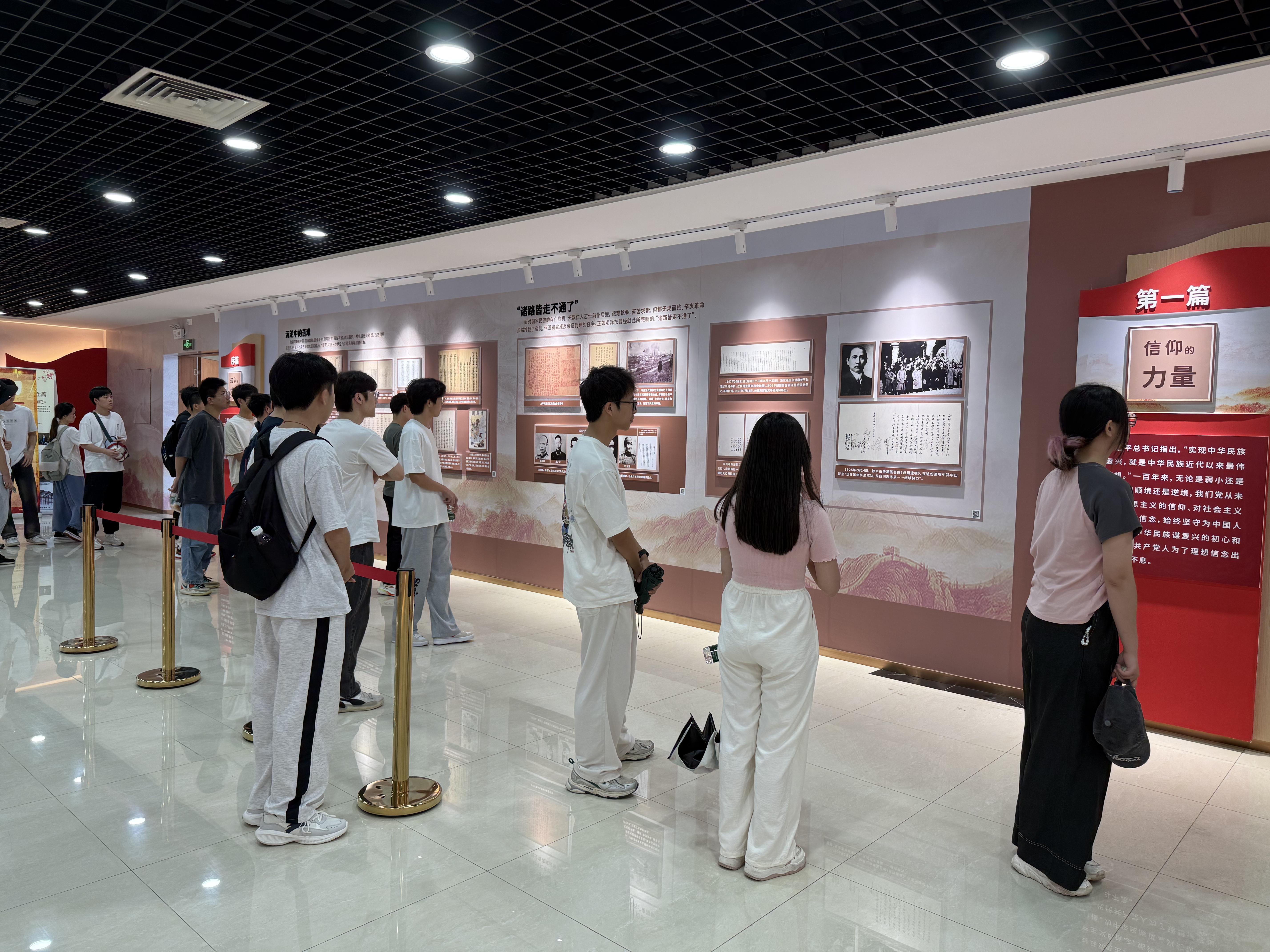 师生们一踏入1号展厅,便被庄重肃穆的历史氛围瞬间笼罩。在"百年恰是风华正茂"主题档案文献展中,九大篇章沿着"抗争与求索—信仰的力量—理论的力量—组织的力量—人民的力量—斗争的力量—行动的力量—制度的力量—万山磅礴看主峰"的脉络次第铺展。展览以系统的叙事,全景式呈现了中国共产党带领人民从觉醒年代到新时代的百年辉煌历程:泛黄的文献手稿、珍贵的历史照片、斑驳的革命文物,共同勾勒出党在烽火硝烟中的抗争轨迹,在理论创新中的思想光芒,在为民奋斗中的初心印记。置身其间,仿佛穿越时空隧道,身临其境般见证了中国共产党波澜壮阔的百年征程,在历史与现实的交织中感受信仰的分量与时代的脉动。