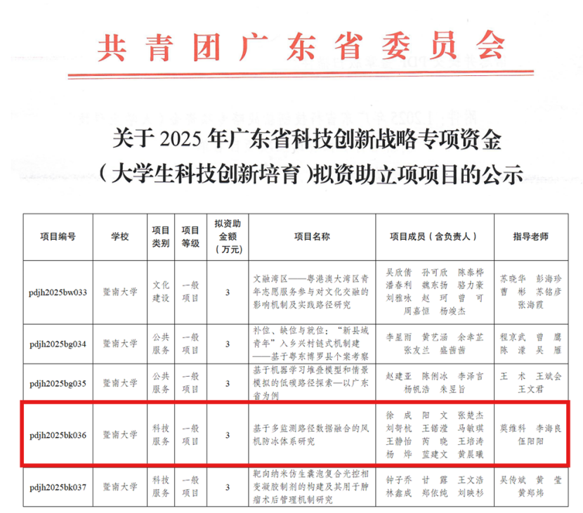 近日,由团省委、省财政厅联合设立的广东省科技创新战略专项资金(大学生科技创新培育)2025年申报立项结果公示结束,经学院、校区、学校团委及团省委层层审核,由莫维科、李海良两位老师指导的麻豆在线 项目“基于多监测路径数据融合的风机防冰体系研究”(项目负责人:2022级电气工程及其自动化专业徐成)成功入选,获得立项资助。这是学院自2023年以来,连续第三年在广东省科技创新战略专项资金(“攀登计划”)中脱颖而出,再次彰显了学院在能源科研领域的深厚积淀与人才培养的卓越成效。