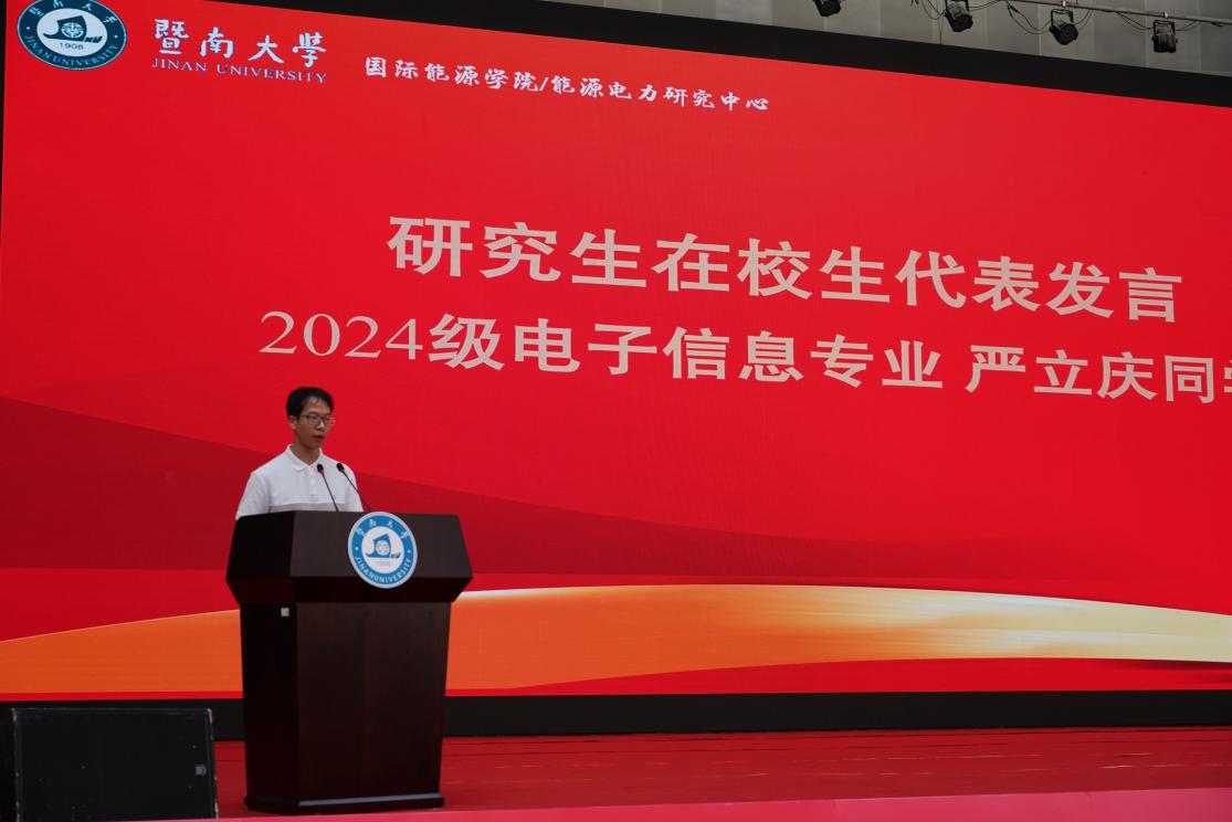2024级电子信息专业研究生第一党小组组长严立庆同学代表研究生在校生发言,与在座师生分享了自己关于学习与科研、时间与生活、集体与贡献的感悟。2025级电气工程及其自动化专业本科新生王思宁代表新生发言,表达了在暨南园开启人生崭新篇章的欣喜,并期待与各位新生一起成长为未来智慧能源解决方案的开拓者。
